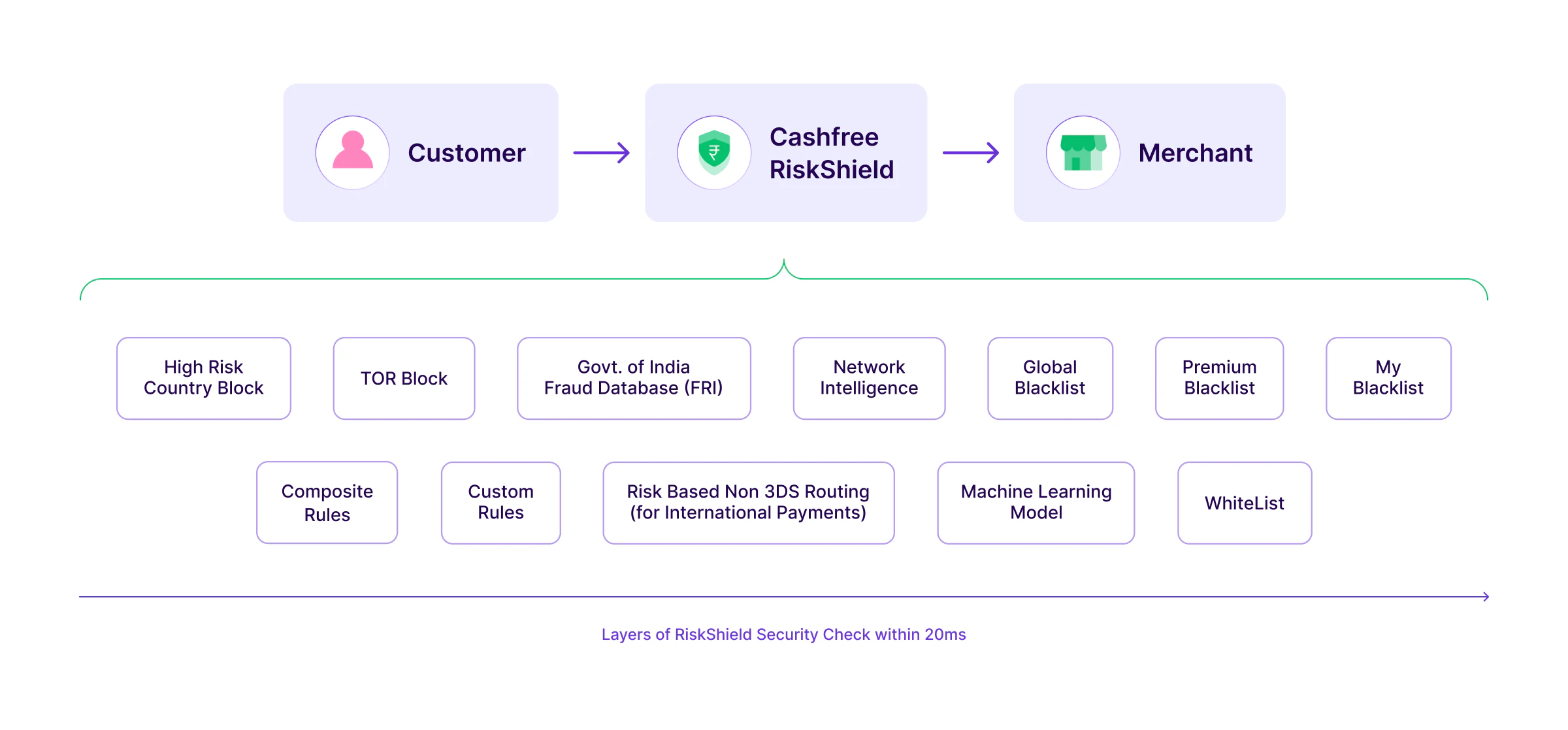 - Transaction Risk and Fraud: Detects and prevents high-risk transactions using ML-driven fraud monitoring, various checks and Integrations with the Government of India, available within RiskShield by Cashfree.