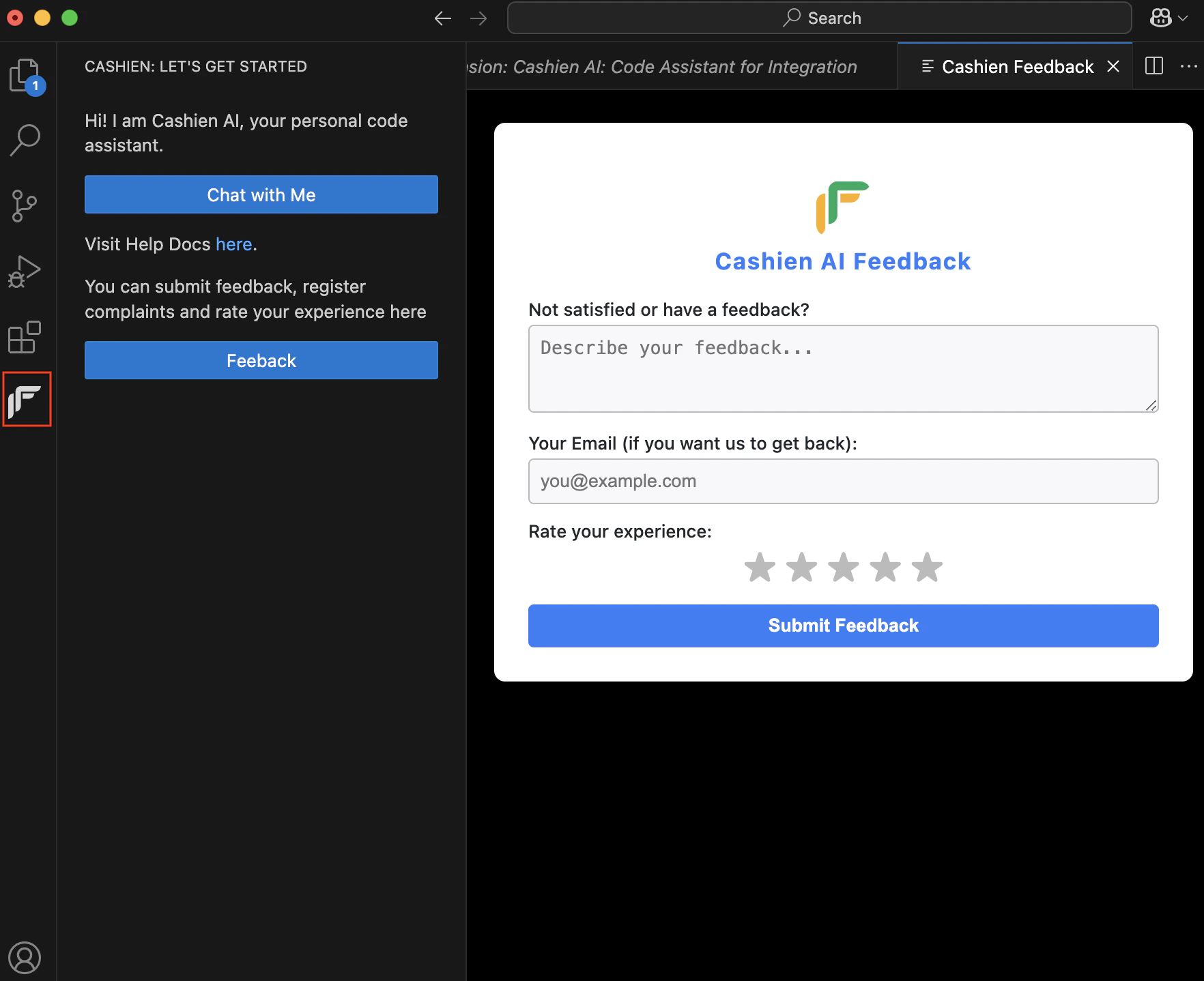 Send us your feedbackHelp us improve Cashien AI by sharing your feedback or reporting issues. To submit feedback, click the Cashfree icon in Visual Studio Code side panel.
